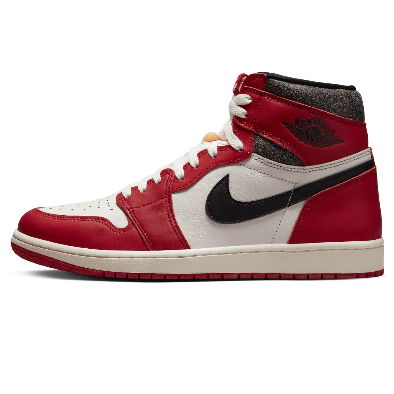 The Air Jordan 1 Retro High OG ‘Chicago Lost & Found’ brings back the iconic silhouette that started it all. Featuring the high-cut shape of the original 1985 release, the leather upper combines a white base with a black signature Swoosh and scarlet overlays at the forefoot and heel. Cracked black leather appears on the padded collar, while a vintage pre-yellowed finish is applied to the white rubber midsole. The vintage ‘80s aesthetic extends to the special packaging, highlighted by a damaged box plastered with sale stickers and topped with a mismatched replacement lid. An accompanying sales invoice is emblematic of a time when the Air Jordan 1 lingered on the shelves of mom and pop stores, eventually making their way into the hands of lucky customers at a steep discount.