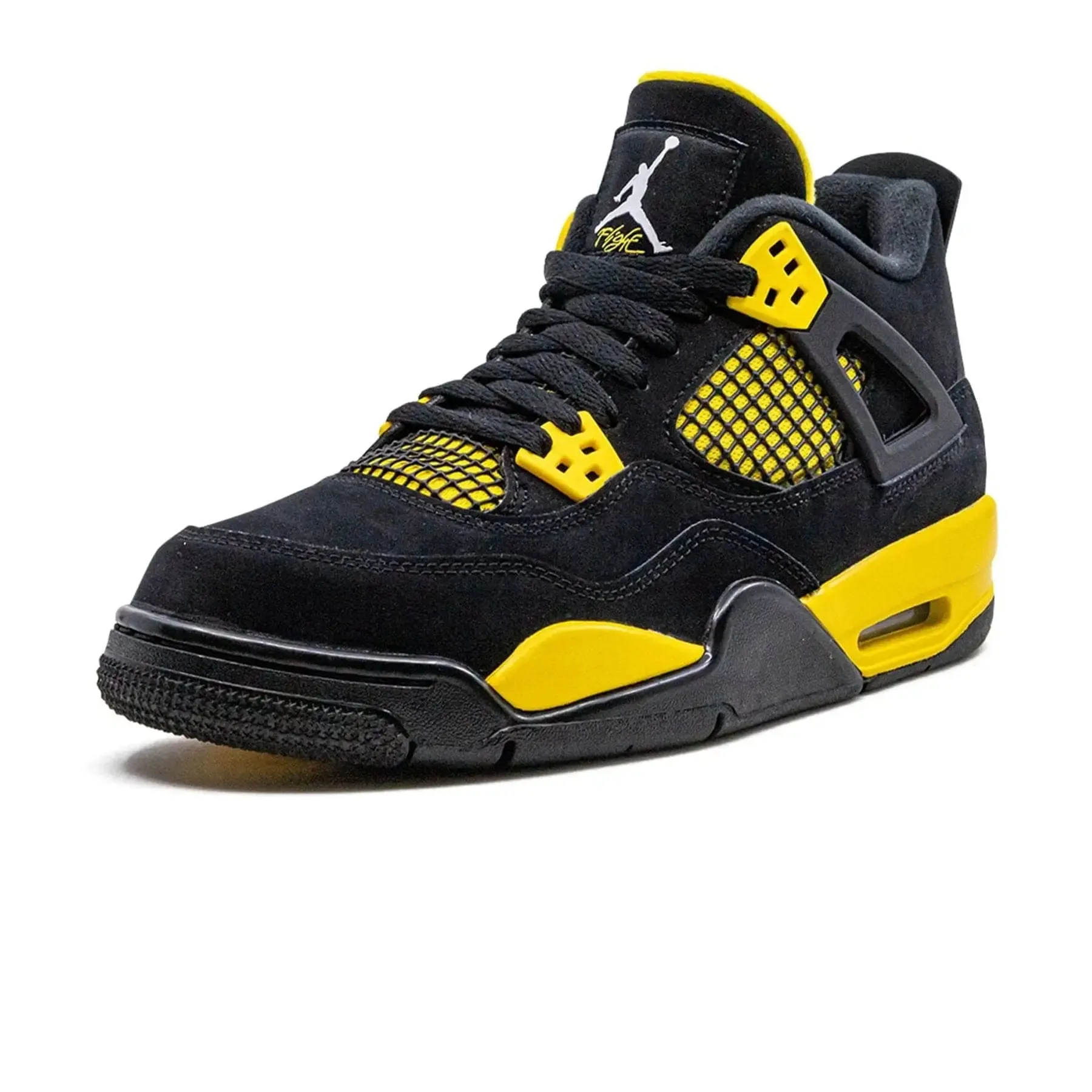 Made for big kids, the 2023 edition of the Air Jordan 4 Retro GS ‘Thunder’ brings back the coveted two-tone colorway originally released in 2006. The mid-top features a black nubuck upper with contrasting yellow accents. They land on the shoe’s molded eyelets, quarter panel and lower tongue, with the latter two components covered in black netting that reflect the AJ4’s original ’89 specs. Traditional Jumpman branding decorates the molded back tab and woven tongue tag. The sneaker rests on a yellow polyurethane midsole, enhanced with visible Air-sole cushioning and supported by a herringbone-traction rubber outsole.